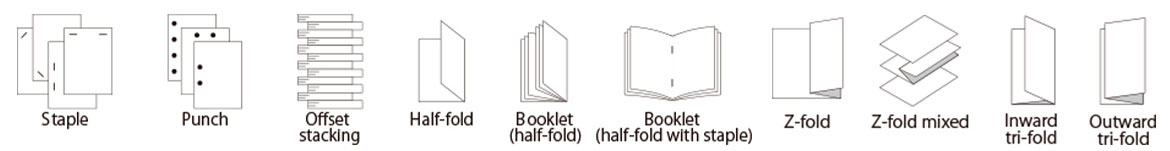 | Функції обробки | Зсув вихідних аркушів, скріплення, перфорація, брошурування, згинання навпіл |